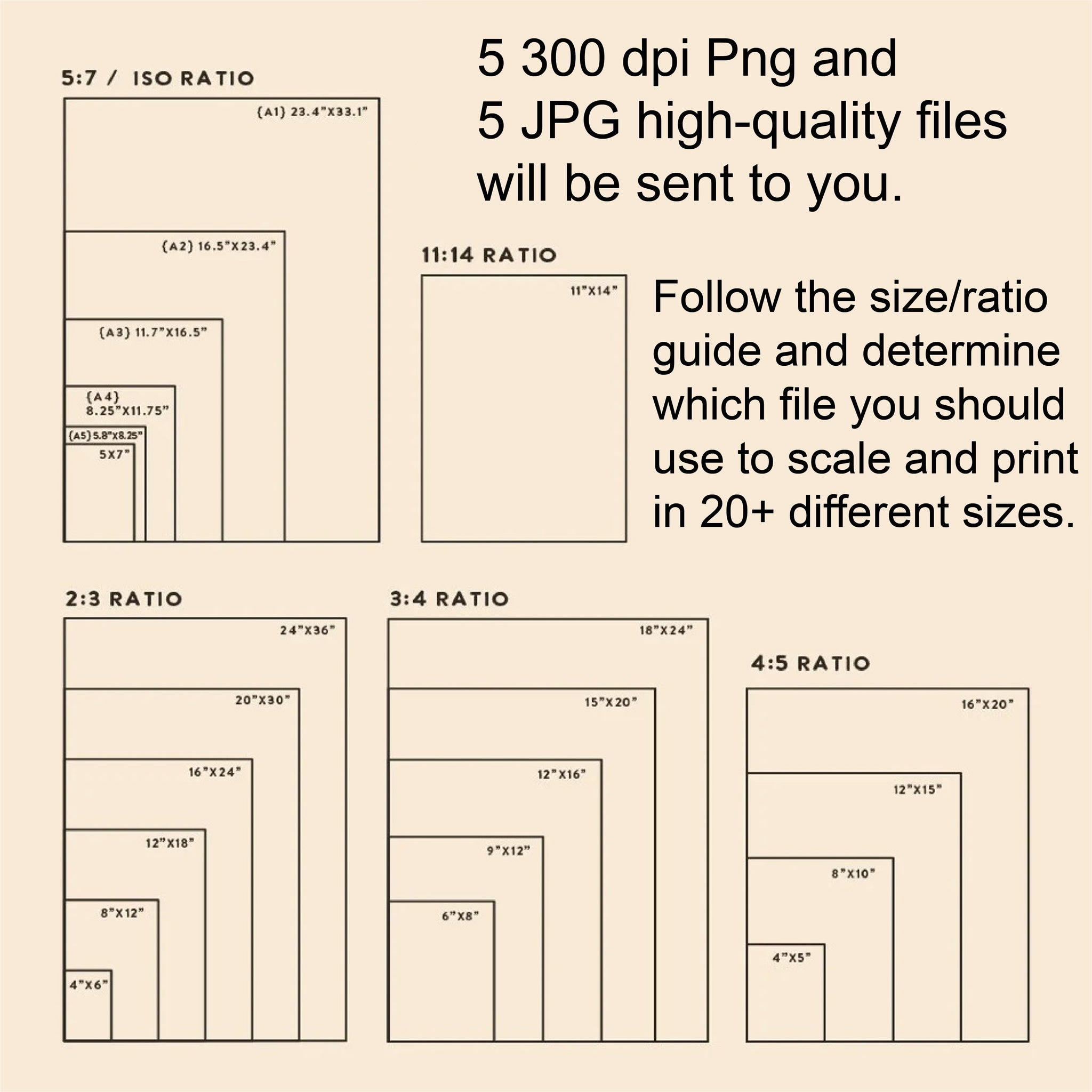 You will receive a .zip file include 5 Designs (5:7 ISO Ratio; 2:3 Ratio; 3:4 Ratio; 4:5 Ratio; 11:14 Ratio)